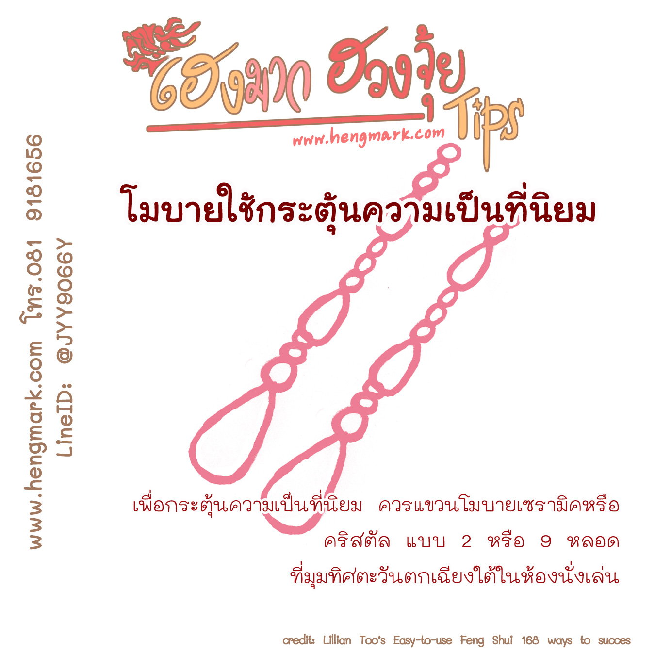 เพื่อกระตุ้นความเป็นที่นิยม ควรแขวนโมบายเซรามิค หรือ คริสตัล แบบ 2 หรือ 9 หลอด