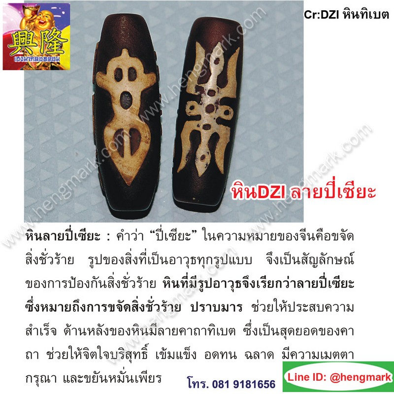 ขจัดสิ่งชั่วร้ายปราบมาร ช่วยให้ประสบความสำเร็จ รูปของสิ่งที่เป็นอาวุธทุกรูปแบบ จึงเป็นสัญลักษณ์ของการป้องกันสิ่งชั่วร้าย ปราบมาร ช่วยให้ประสบความสำเร็จ ด้านหลังของหินมีลายคาถาทิเบต ซึ่งเป็นสุดยอดของคาถา