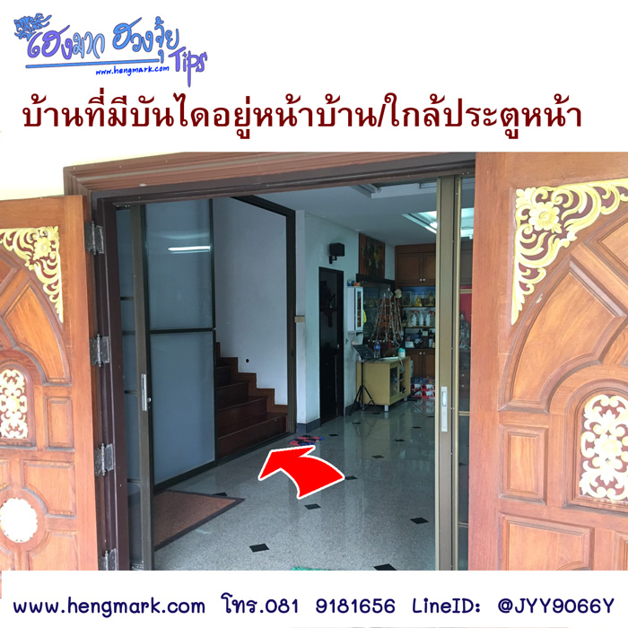 ตามหลักฮวงจุ้ย ไม่แนะนำให้สร้างบันไดที่หน้าบ้าน พอเดินเข้าประตูบ้านเข้ามา เห็นบันไดบ้าน โชคลาภที่เข้ามา จะไหลขึ้นบันได และออกที่ประตูหน้าด้านบนหมด ไม่สามารถดักโชคลาภไว้ได้